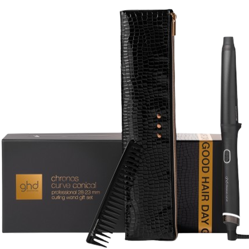 ghd, le cadeau 5 étoiles. Avec le coffret cadeau ghd Curve Chronos Conical Wand, transformez vos cheveux en un seul geste. Composé du boucleur professionnel ghd au diamètre 28-23 mm, du peigne démêloir ghd Comb Out, d’une pochette thermorésistante¹ et d’un gant de protection, ce coffret vous offre le luxe d’une coiffure digne d’un salon de coiffure.