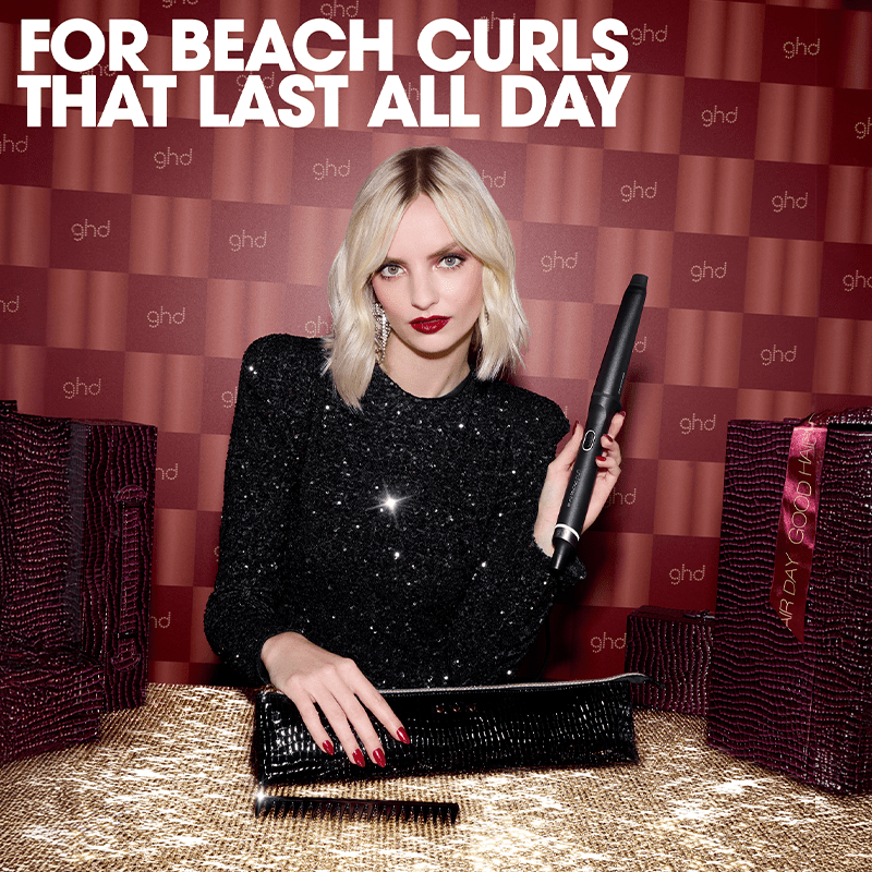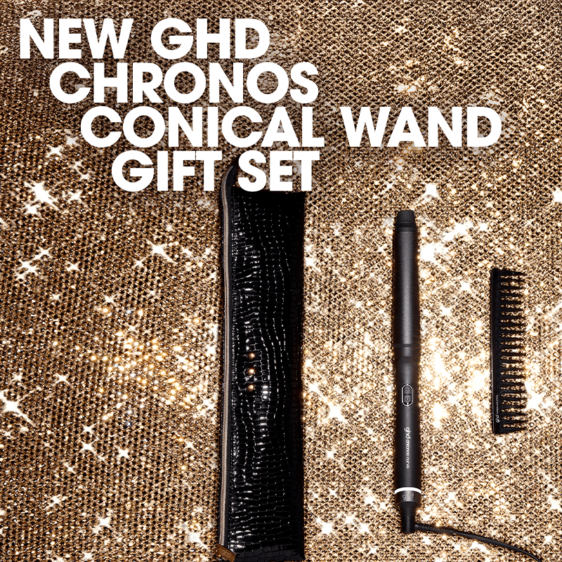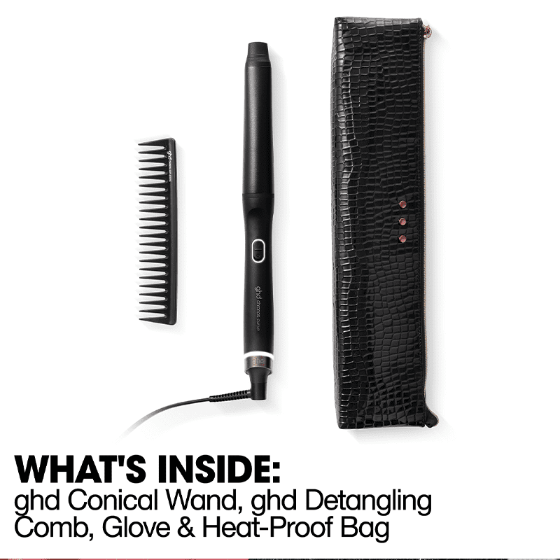 Notre boucleur, ghd Chronos Curve Conical Wand, est accompagné d’une pochette exclusive thermorésistante et d’un peigne démêloir ghd pour un coiffage tendance pendant les fêtes.