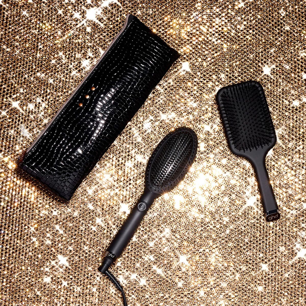 Notre brosse chauffante lissante, ghd Glide, est accompagnée d’une pochette exclusive thermorésistante² et d’une brosse à cheveux plate ghd pour un coiffage rapide et maîtrisé pendant les fêtes.
