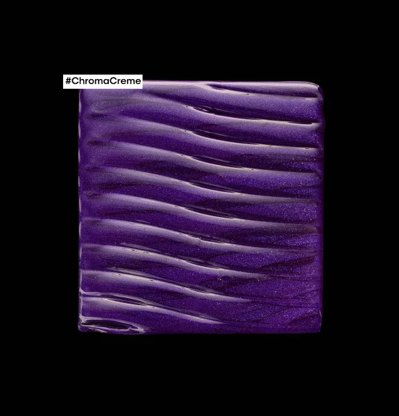 Chroma Crème Violet neutralise instantanément les reflets jaunes indésirables et nourrit intensément la fibre, sans l’alourdir.