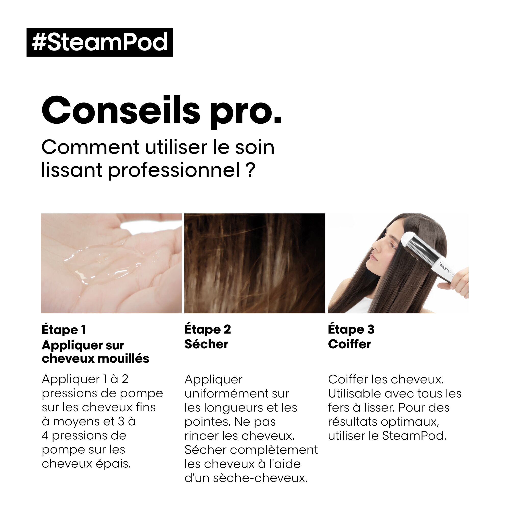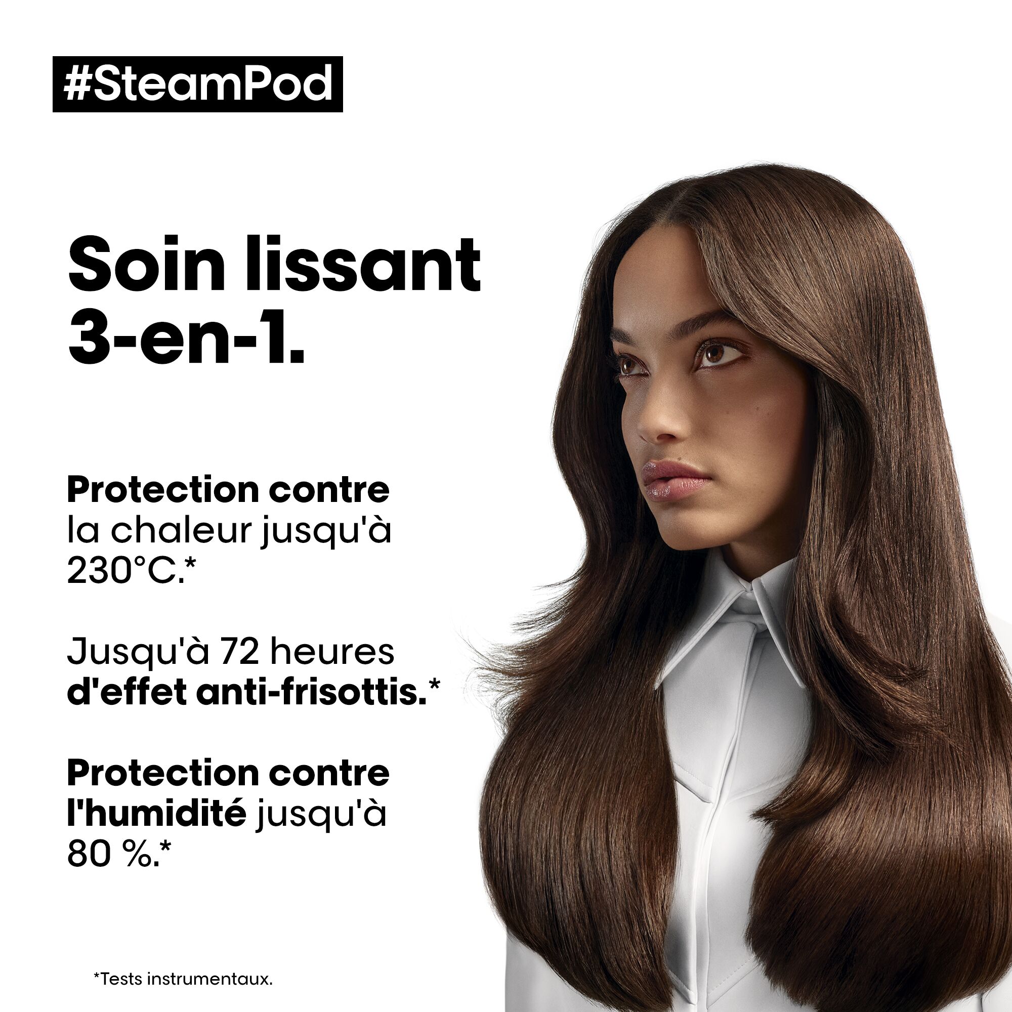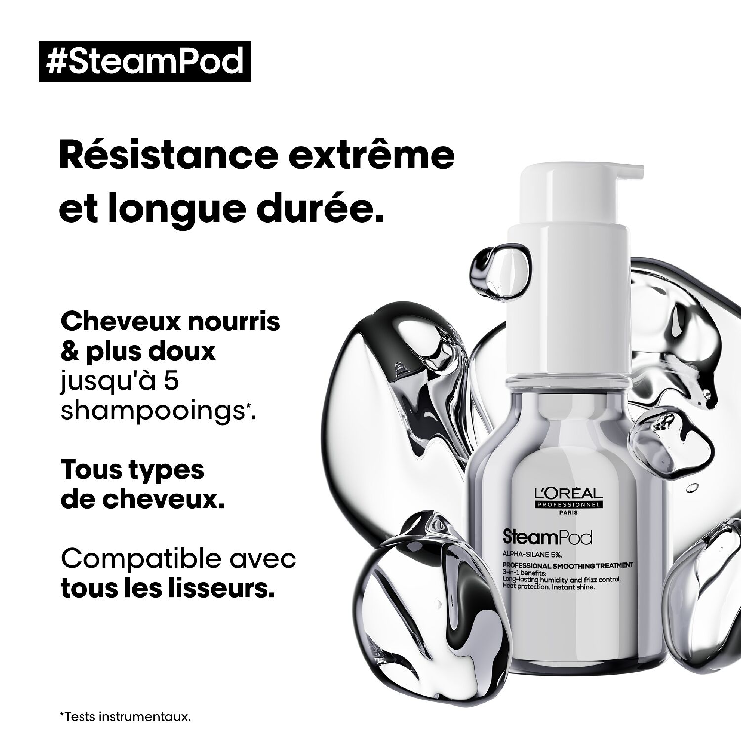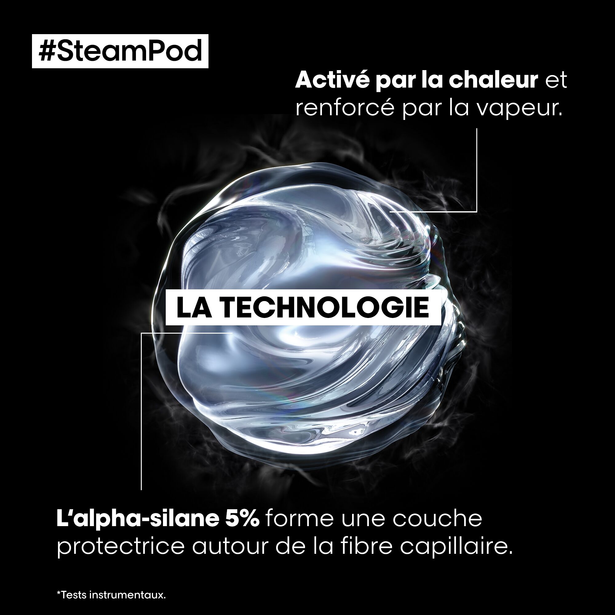 Le Soin Lissant Professionnel Steampod L’Oréal Pro est le premier soin thermoprotecteur enrichi en Alpha-silane, un actif qui protège les cheveux des dommages causés par la chaleur et l’humidité.